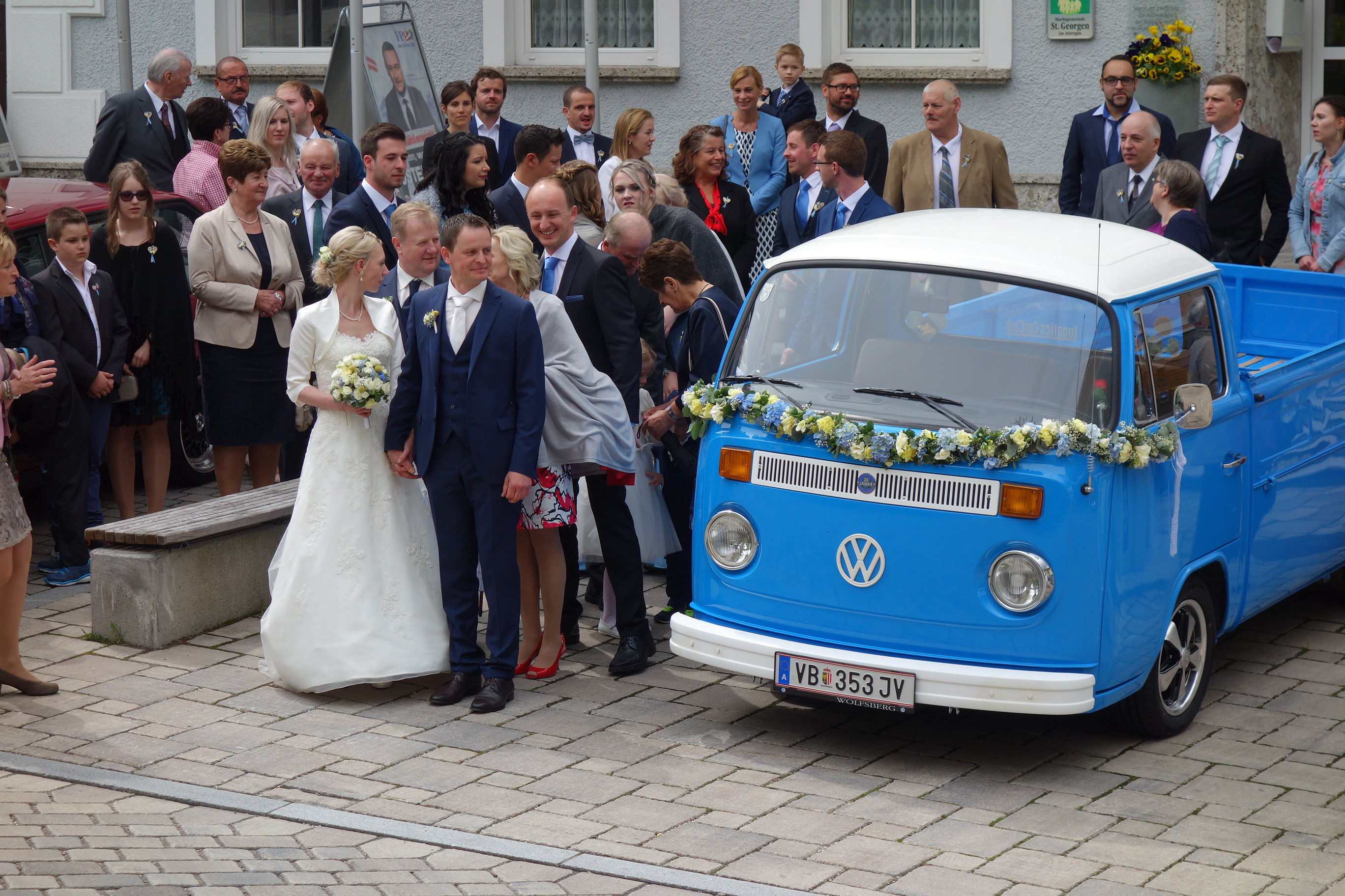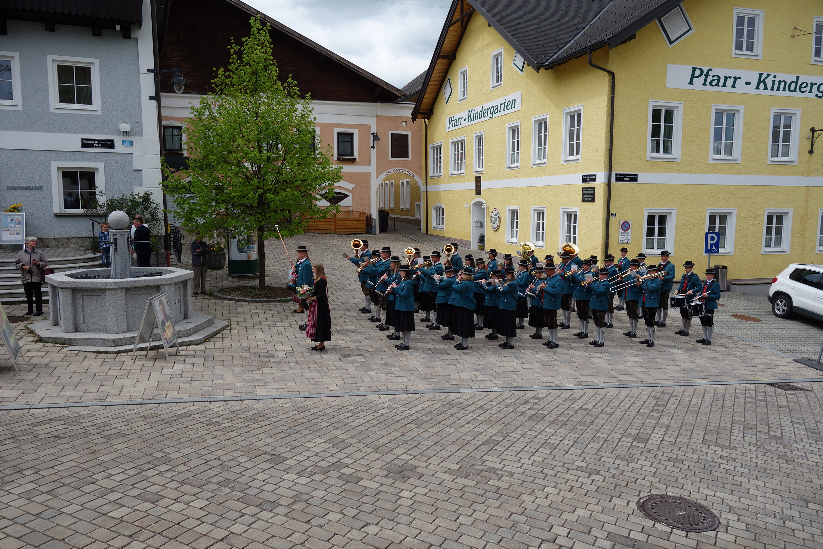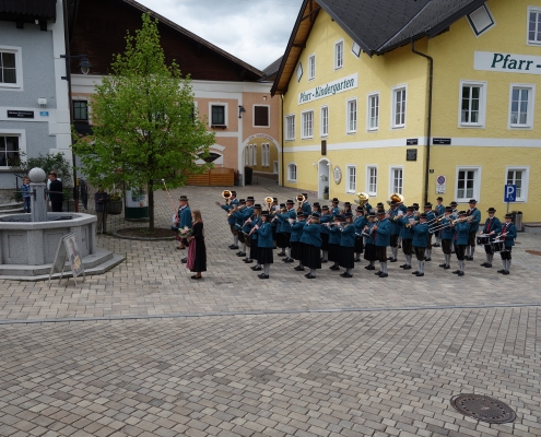 Wir begrüßten das Brautpaar mit einigen Märschen vor dem Gemeindeamt. Gemeinsam marschierten wir dann zur Pfarrkirche St. Georgen, wo die kirchliche Trauung stattfand.